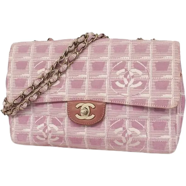 シャネル ニュートラベル ショルダーバッグ ナイロンキャンバス ピンク×シルバー金具 チェーンストラップ