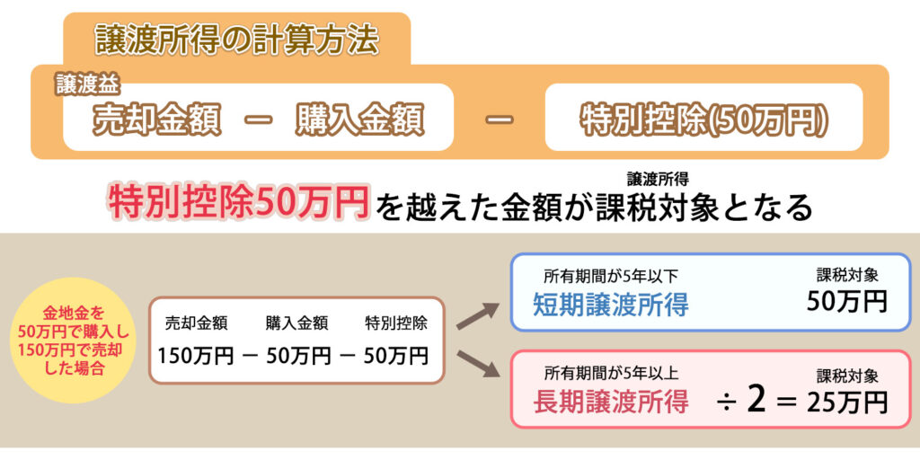 金の売却によって生じた譲渡所得には、年間で合計50万円までの「特別控除(とくべつこうじょ)」という非課税枠が設けられています。