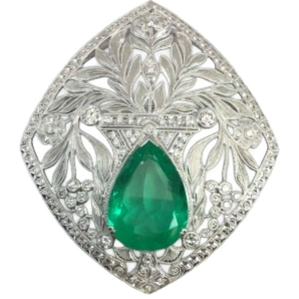 Pt・Pm900 エメラルド・ダイヤモンド ブローチ E15.77 ct D1.363 ct買取の