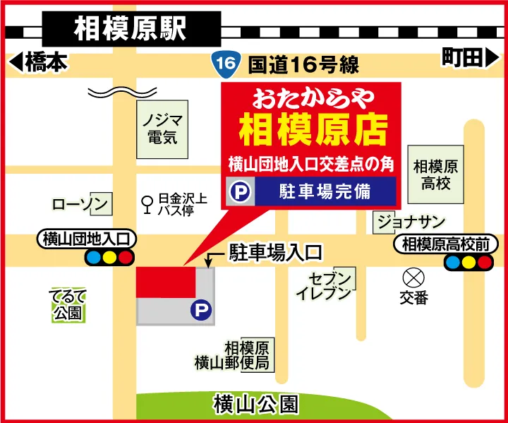 「おたからや相模原店」は、相模原駅南口バスに乗り、日金沢上バス停より徒歩2分の場所にあります。