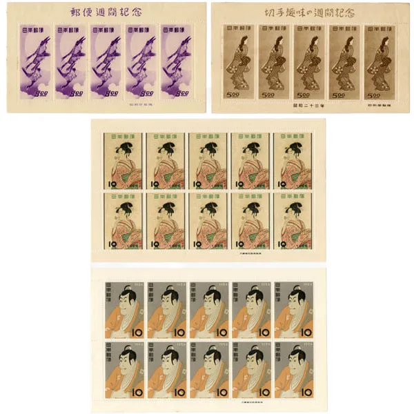 日本記念切手アルバム計4冊 月に雁 見返り美人5枚シート 文化人 国立公園 犬山こども博覧会小型シート他