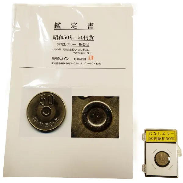 昭和50年 50円硬貨 (50円白銅貨) 穴なしエラーコイン 鑑定書付