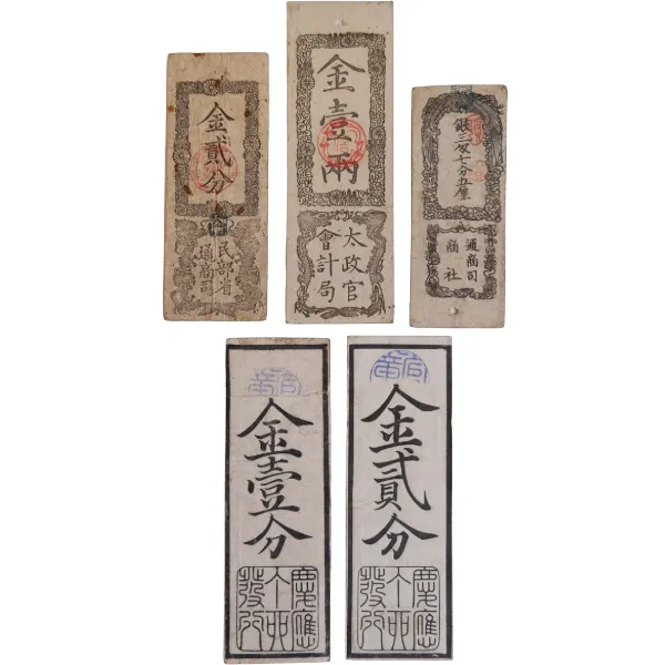 民部省札 金貳分 太政官札 金壹両 兵庫開港金札他 計5枚